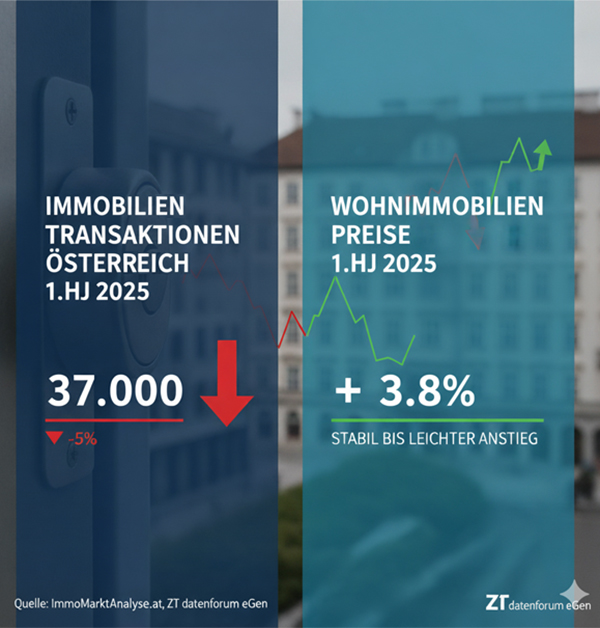 - Weniger Transaktionen, stabile Preise: Im 1. Halbjahr 2025 gab es ca. 5 % weniger Immobilientransaktionen. Besonders betroffen sind die südlichen Bundesländer Steiermark und Kärnten. Dennoch stiegen die Preise für Bestands- und Neubauwohnungen sowie Wohngebäude weiter an.